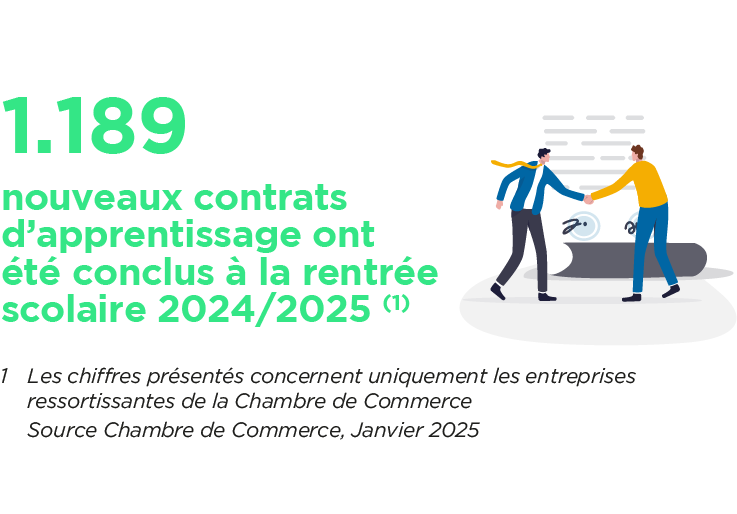 En collaboration avec les autres acteurs de la formation professionnelle initiale, la Chambre de Commerce participe à l’élaboration des programmes de formation professionnelle ainsi qu’à l’organisation de l’apprentissage. Elle gère chaque année près de 2.000 contrats d’apprentissage dans différentes professions des secteurs du commerce, de l’industrie, de l’hôtellerie et de la restauration, des services et du domaine socio-éducatif.